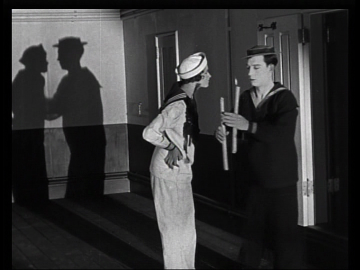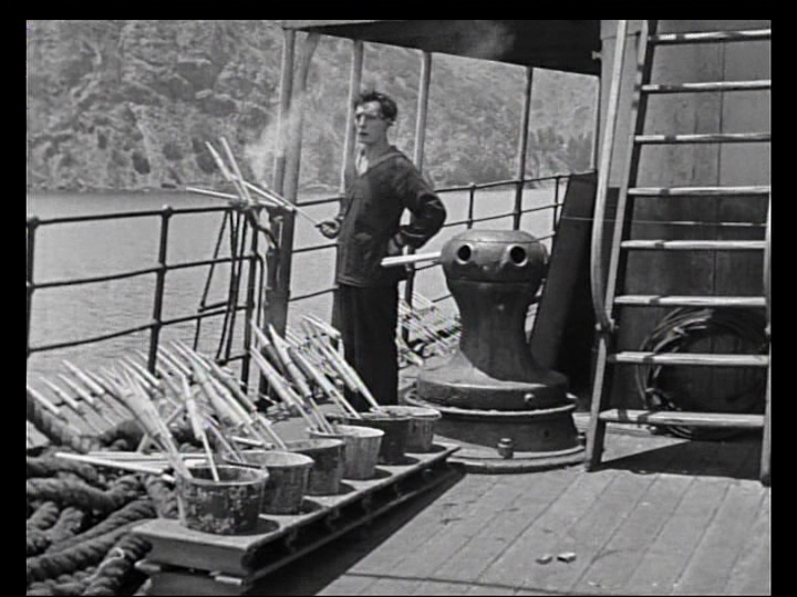 Keaton's The Navigator contains an underwater sequence that - especially for its day - is quite impressive. With a bulky diving suit on, Keaton is filmed using a lobster as a pair of scissors, fencing with a swordfish and fighting off an octopus. There's also some inventive and silly humour in the kitchen and a variety of Buster's slips and bumblings, but the dominant scenes are around an encounter with dark-skinned cannibal savages. They want to board the abandoned ship on which Keaton and his potential girlfriend have been stranded, but not much funny happens during these extended scenes and they seem to only serve two purposes: 1) reminding the "savages" of their inferiority and 2) allowing a good final gag to save them. At 58 minutes, it's pretty breezy, but even so it slogs a bit once they reach that island.